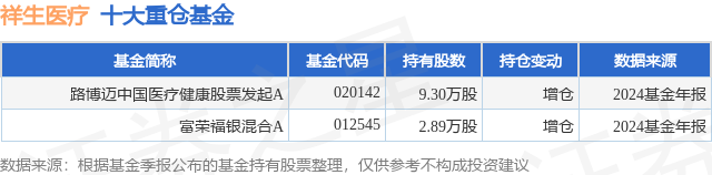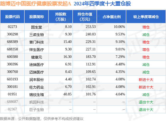 该股最近90天内共有3家机构给出评级,买入评级3家。 根据2024基金年报公募基金重仓股数据,重仓该股的公募基金共2家,其中持有数量最多的公募基金为路博迈中国医疗健康股票发起A。路博迈中国医疗健康股票发起A目前规模为0.11亿元,最新净值0.7601(1月22日),较上一交易日下跌1.05%。该公募基金现任基金经理为李涛。 路博迈中国医疗健康股票发起A的前十大重仓股如下: